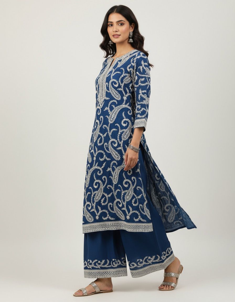 Experience timeless elegance with this stunning blue kurta adorned with intricate white embroidery, paired perfectly with comfortable palazzo pants. Ideal for festive occasions or casual wear, this ensemble combines traditional charm with modern comfort for a graceful look.