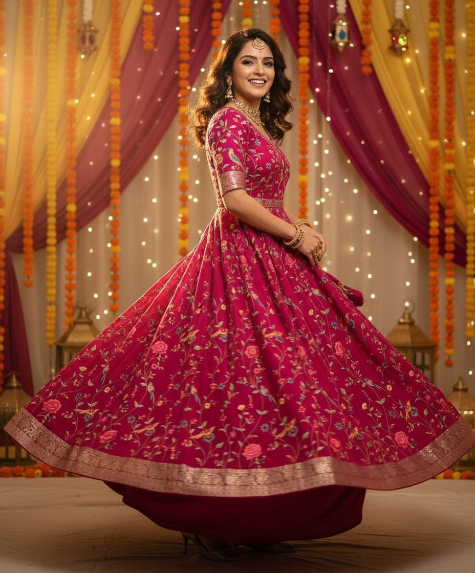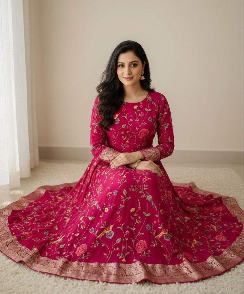 This stunning magenta Anarkali features intricate floral embroidery with delicate birds, perfect for festive occasions or elegant gatherings. Crafted with fine fabric and detailed borders, it offers a graceful silhouette for a timeless, sophisticated look.