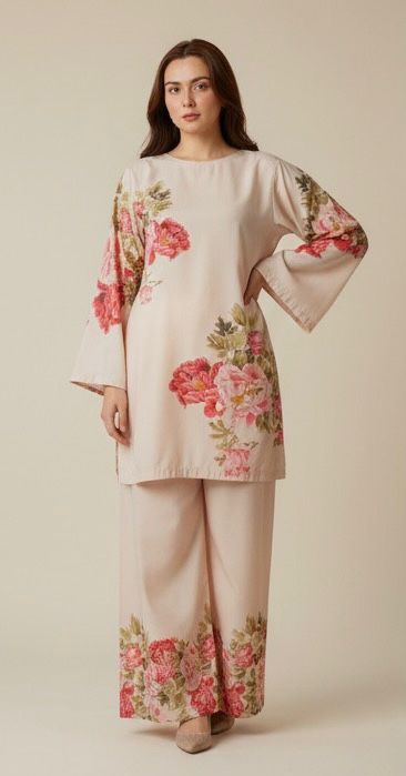 This elegant pastel beige co-ord set features a relaxed straight-cut kurta with wide sleeves and matching palazzo pants, adorned with bold pink floral motifs along the sleeves, sides, and hems for a soft yet striking look.The breathable fabric and flowy silhouette make it perfect for all-day comfort, ideal for casual outings, brunches, or at-home get-togethers while keeping your style effortlessly chic.