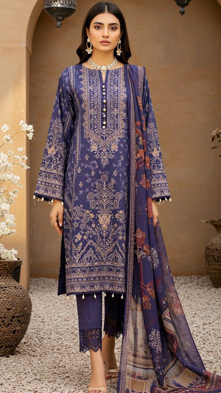A rich navy printed lawn suit featuring intricate beige floral motifs, a straight-cut kurta with pearl buttons, matching lace-hem pants, and a coordinated printed dupatta for a regal festive look