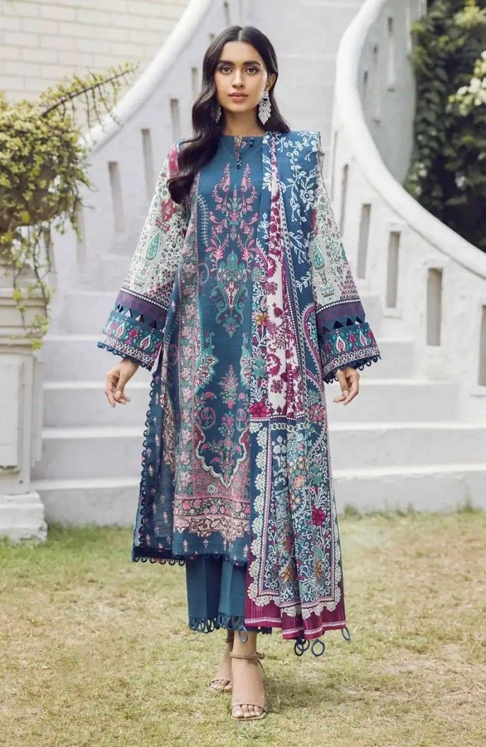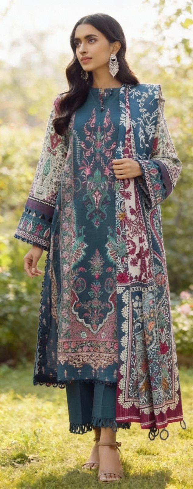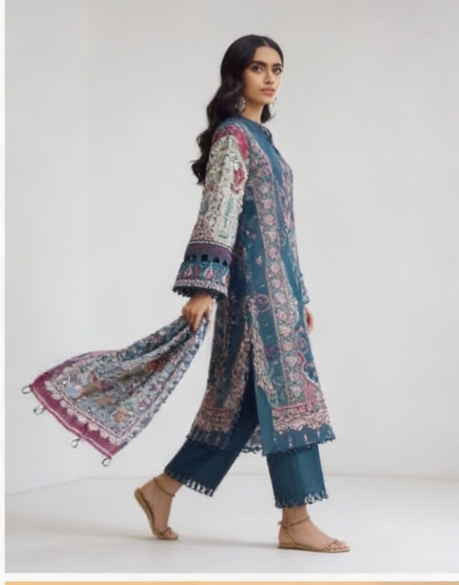 Description- A chic teal lawn suit featuring intricate paisley and floral prints in maroon, ivory, and green, paired with a matching printed dupatta and solid straight pants for an elegant, ready-to-wear ethnic look.